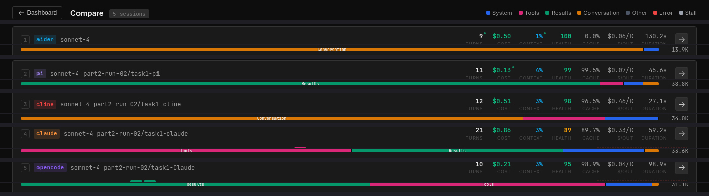 Aider’s context is tiny but its output is enormous. 13.8K tokens in, 8.7K tokens out. Because it doesn’t use tools, it returns the entire modified file as text in its response, where every other tool uses an Edit or apply_patch operation that only costs a few hundred tokens. Aider also has zero cache hits because it doesn’t use Anthropic’s prompt caching at all, which means it pays full price on every single turn.